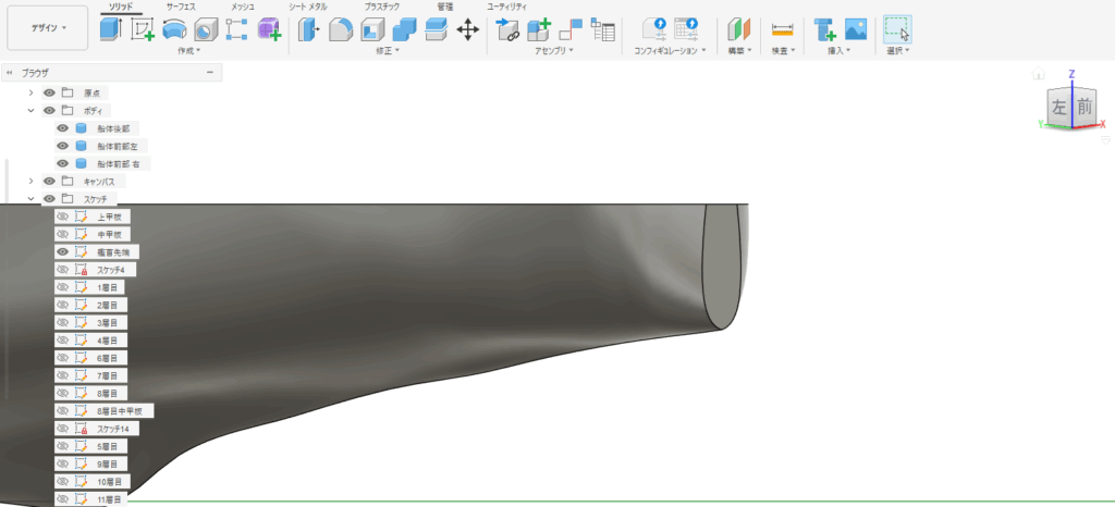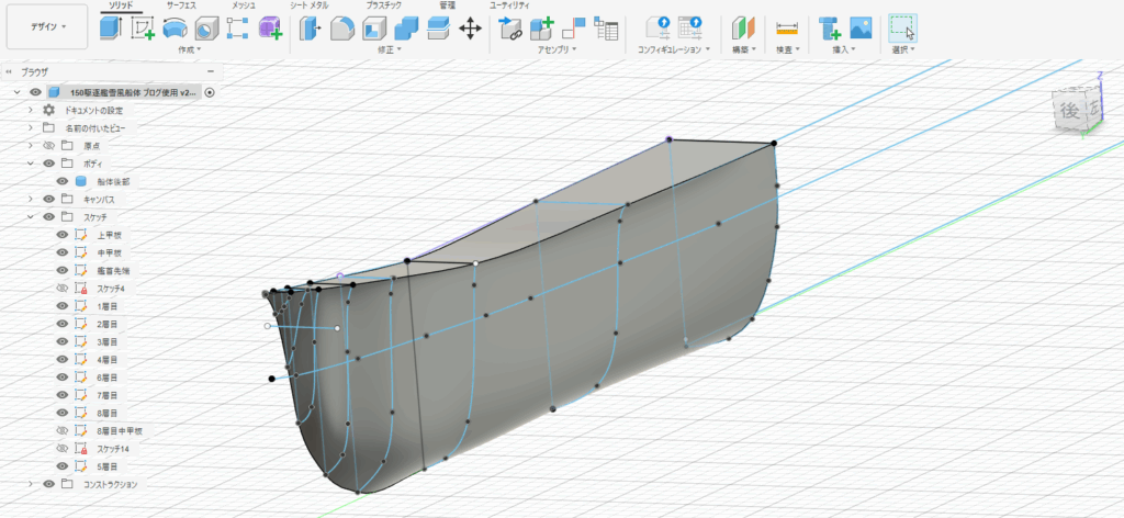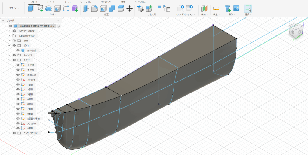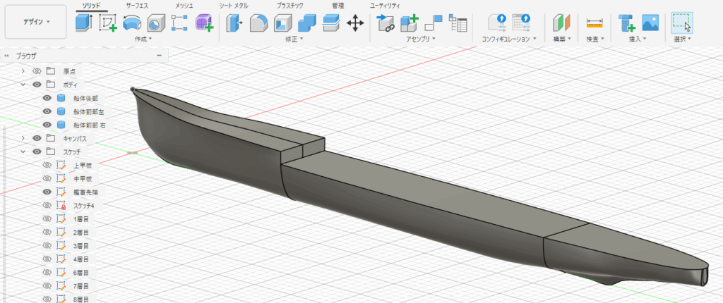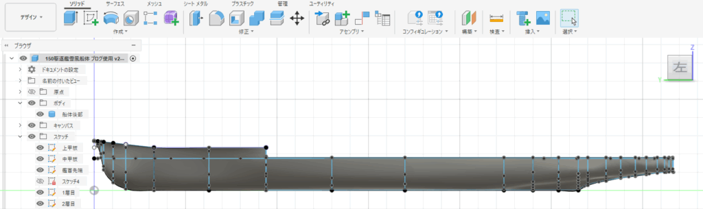 Fusion 360 では、船体を片側だけ作成しておき、最後に「ミラー」機能を使って左右対称の船体を完成させる方法が最も効率的です。
