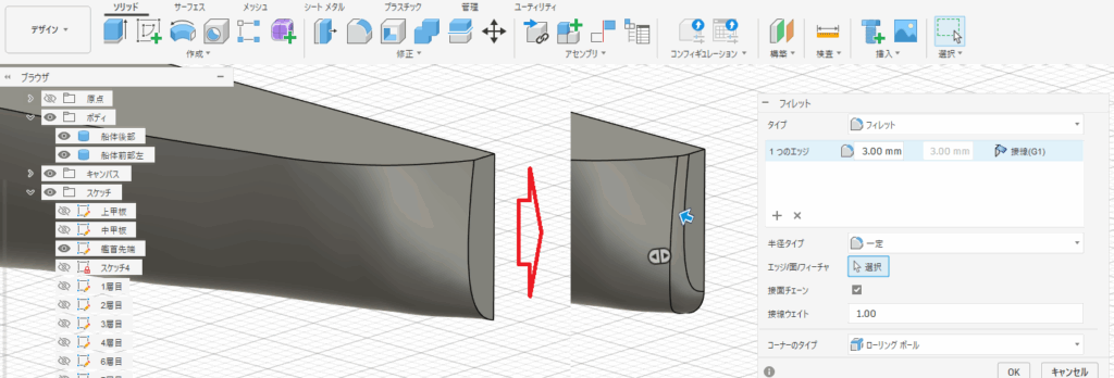作業中に片側だけフィレットした場合、左右の丸みが揃っていないケースがあるため調整します。