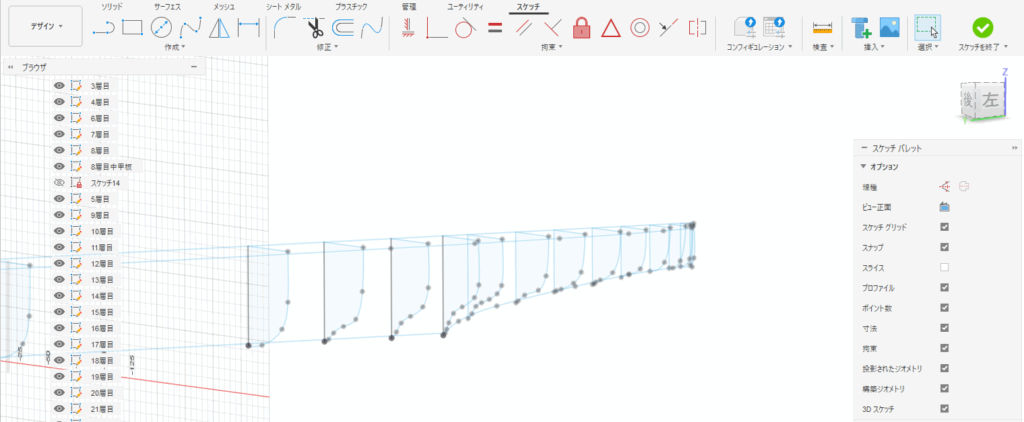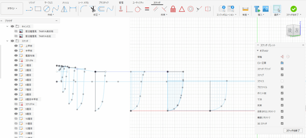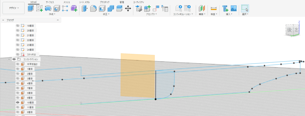 少し面倒だけどオフセット断面や断面のスケッチは何層目かを入れておくと後で修正する時に見つけやすいよ