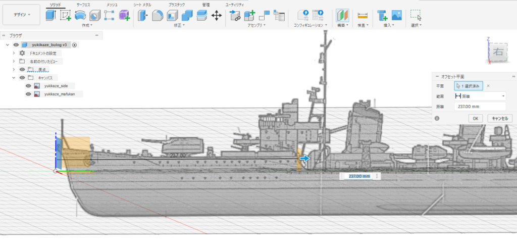 →「平面」で基準となる平面を選択(この場合YZ平面)→「範囲」原点からの距離(この場合237.00mm)を入力
