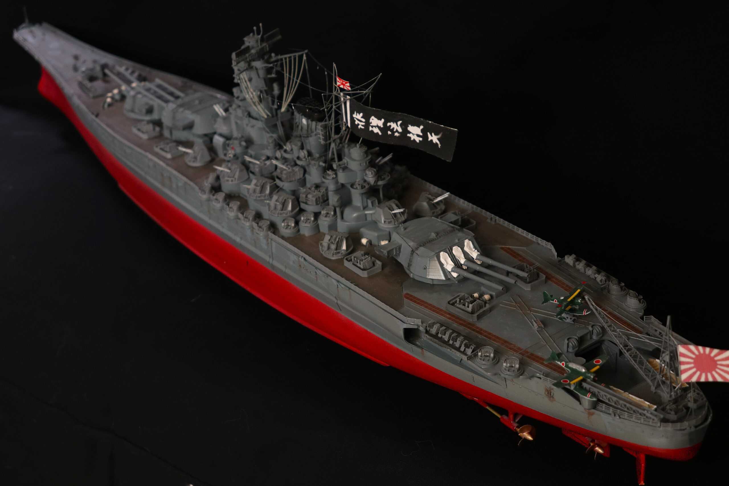 1/350 タミヤ製戦艦大和の武装を思い切り対空装備に振ったIF改装です。15.5cm副砲を取り外し 65口径10cm高角砲改二A型及びB型を計24基搭載。30連装噴進砲を多数。40mm連装機銃も多数載せました。これらの装備自体はiFではなく、日本の工業力、資源が十分にあればもしかしたら装備できたかも知れません。そんなロマン装備です。それとラジコン仕様になっているので水上を走ることができます。