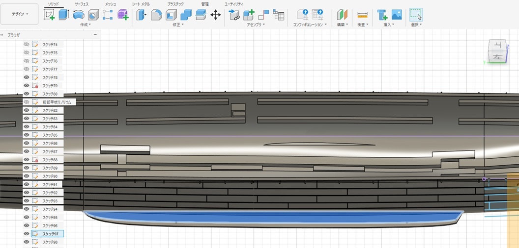 - 船体に接触するあたりの水平面にオフセット平面を作りスケッチ