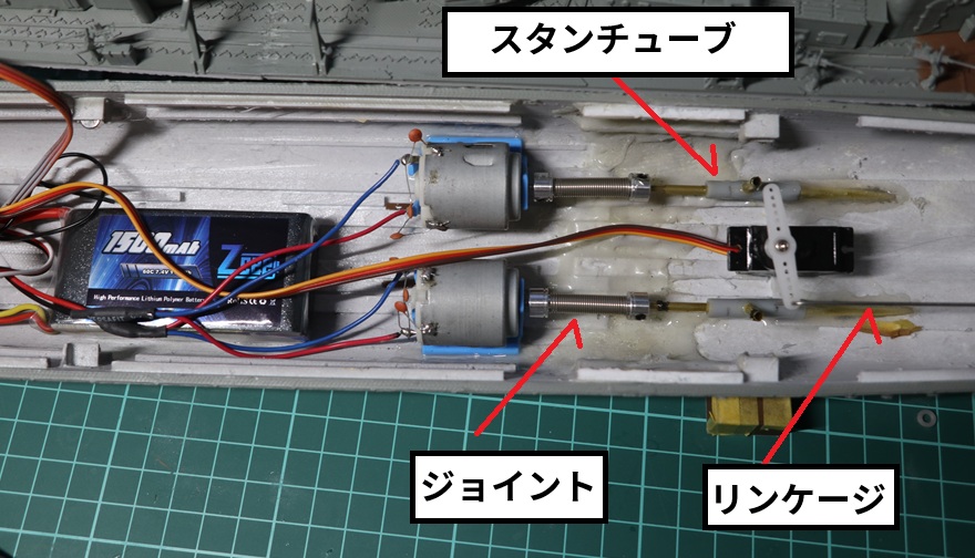 - 推進系は「モーター→ジョイント→シャフト→スタンチューブ→スクリュー」を一直線にし、抵抗が増えないように調整します。