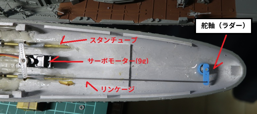 サーボ → リンケージ(ロッド) → 舵軸(ラダー)